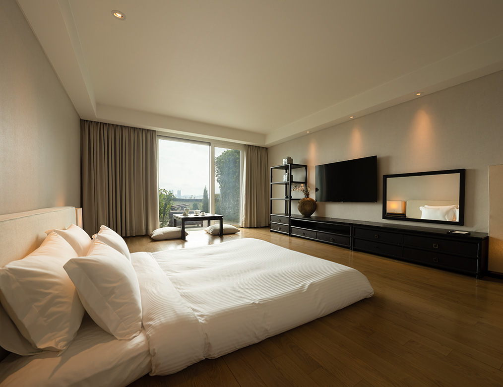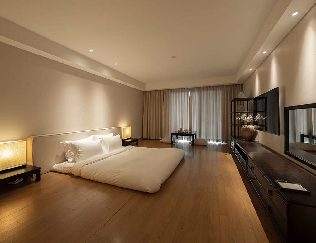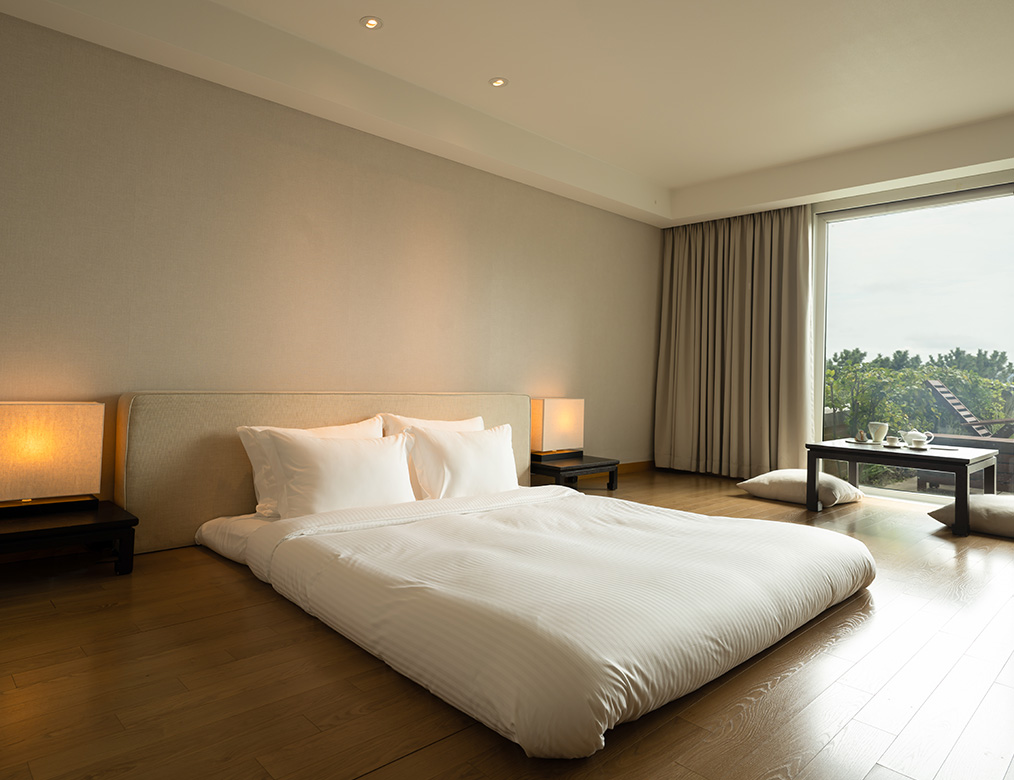편안한 온돌 테라스 룸에서 부산 앞바다의 싱그러운 햇살이 비치는 공간